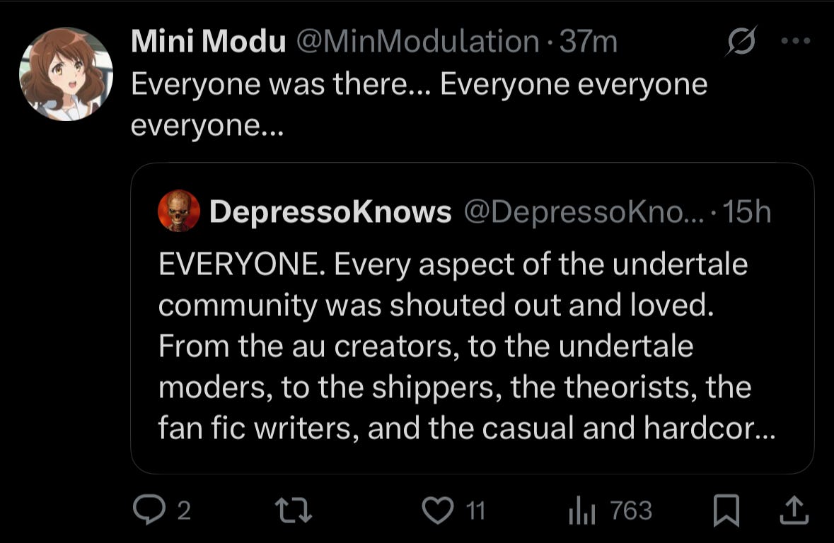 Min Mod shames the Undertale community for the โeveryoneโ meme that excludes outsiders - most notably me, whose suffering was celebrated by some Undertale fans - the leftist lgbtq types - and had their sadism unobserved by excluding me from โeveryoneโ to much psychological pain - which shows her following after my observations that some trans arise from dispersing identity online through politics. Toby course-corrected on appeasing his deranged leftist fans most of all - contrary to the claim that there was never an issue with these Americans - due to my pressure, but that leaves the Undertale community a deranged echo of the โeveryoneโ egregore to me, not friendly people who can support my life and my Underrealm, unlike Min Modโs followers, hence liking being a small artist.