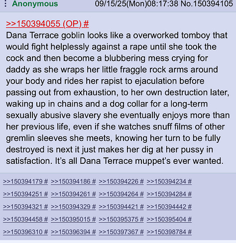 The sexual fantasy is inspired by my meat grinder brain hunting out Danaโs female peers and processing their horrible femininity that tormented my innocence by replacing my kinky 2012 life with ipgd manifested in Battyโs webcomic with their horrible unloving misinterpretations of my masculinity. Dana and batty being almost the only mentions shows the presence of my brand and its foreboding threat towards those who get in my way.