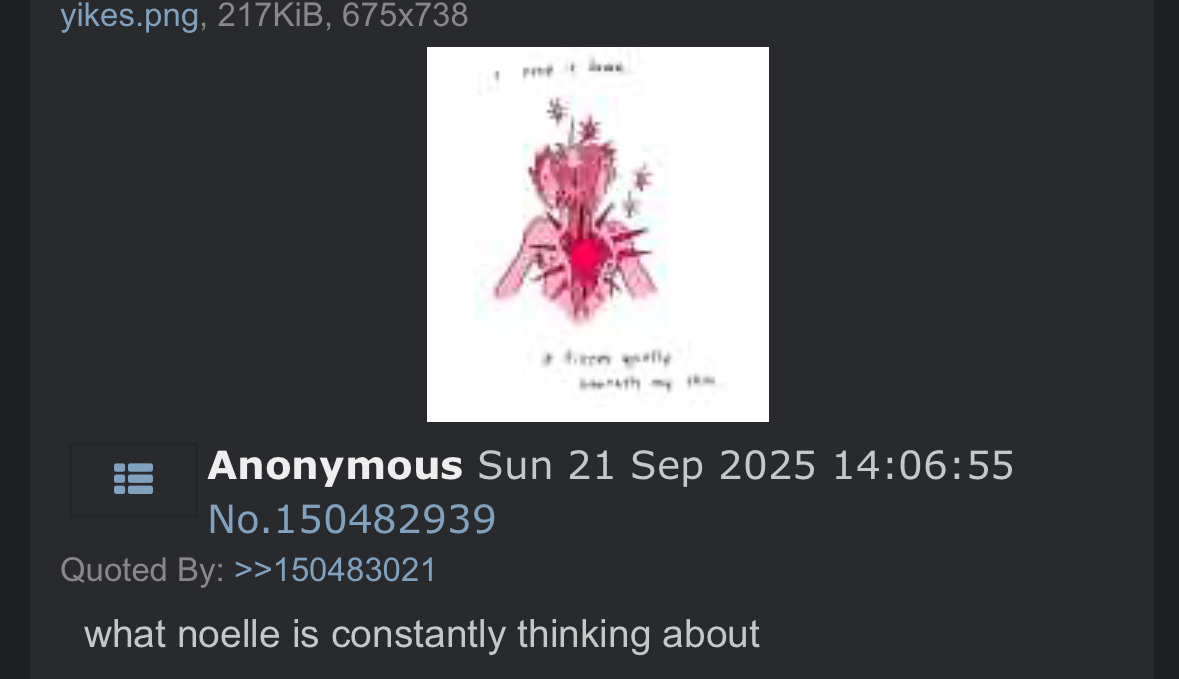 Speaking of /co/ girls going trans without me led to a thread harrowing me about the creator of She-Ra PoP. The commenters may be ignorant of the meaning of their posts, but society interacted with me about her and my podcast with them as its mechanisms. I posted about straitjackets and cages as they are a solution to her psychological distress (when applied by specifically me), so society ingests my solution no matter how weird people find it โ having a solution outweighs feelings when it comes to societyโs ranking of you. The intense pain and sensation of the thread is itself proof of how objectively important I am in society - hence Battyโs fans celebrating Achillesโ pain passion. The thread - as a single mind - feels very appealingly submissive, connecting to my need for more submission in society.